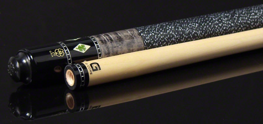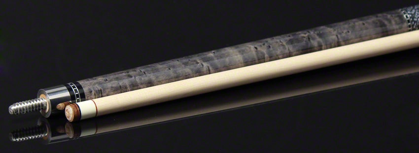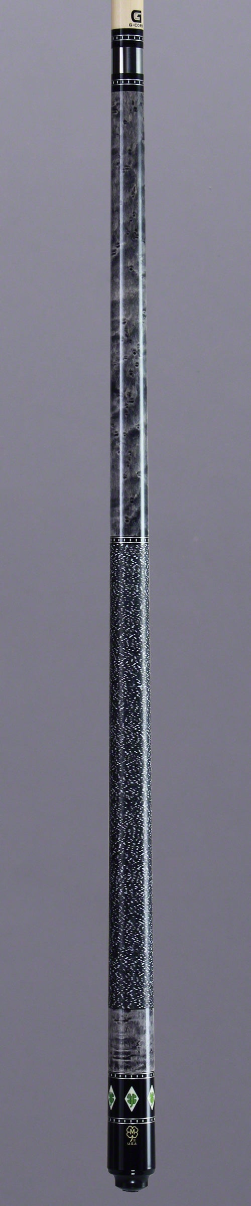 McDermott G332 pool cue has a Titanium grey stained Birdseye maple forearm. The butt sleeve is Titanium grey Birdseye Maple with a black band containing 6 white diamond and green urethane inlays. Completing cue is a black and white Irish linen wrap, custom ring work, and G-Core shaft.